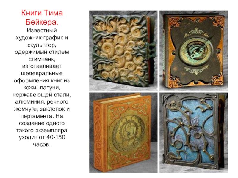 Слайд 29Книги Тима Бейкера. Известный художник-график и скульптор, одержимый стилем стимпанк,