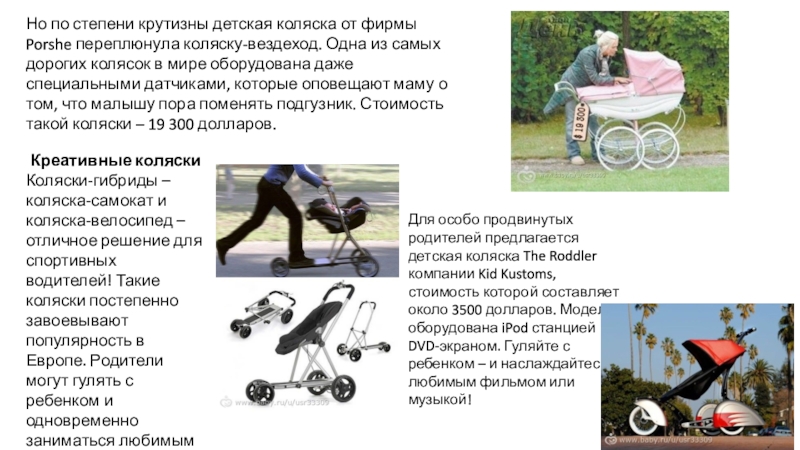 Для особо продвинутых родителей предлагается детская коляска The Roddler компании Kid Kustoms, стоимость которой составляет около 3500 долларов. Модель оборудована iPod станцией и DVD-экраном. Гуляйте с ребенком – и наслаждайтесь любимым фильмом или музыкой!