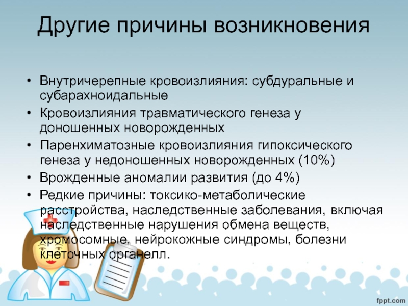 энцефалопатией . Следующие по частоте причины – сепсис, менингит и субарахноидальное кровоизлияние, за ними следуют внутриутробная инфекция и родовая травма.