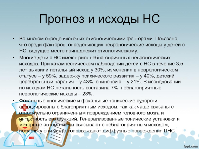 Многие дети с НС имеют риск неблагоприятных неврологических исходов. При катамнестическом наблюдении детей с НС в течение 3,5 лет выявили летальный исход у 30%, изменения в неврологическом статусе – у 59%, задержку психического развития – у 40%, детский церебральный паралич – у 43%, эпилепсию – у 21%. В исследовании по исходам НС летальность составила 7%, неблагоприятные неврологические исходы – 28%.