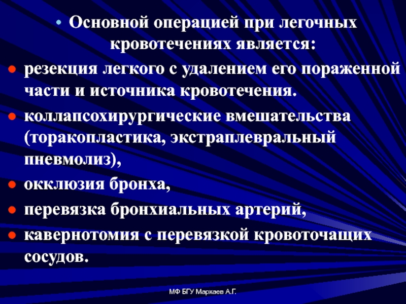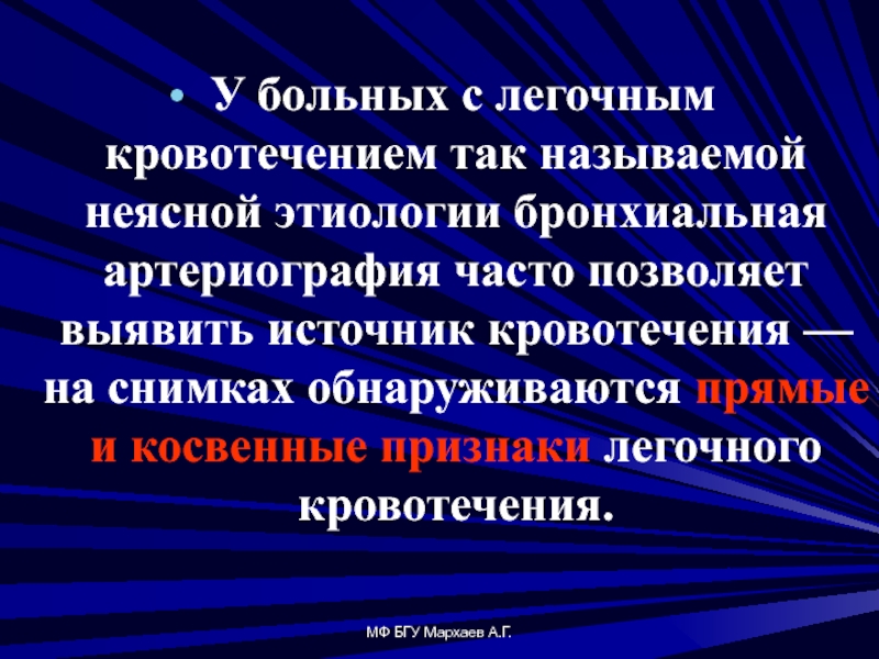 Источниками кровотечений были в основном сосуды малого круга кровообращения — аррозированные ветви легочной артерии.