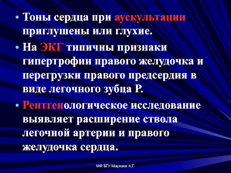 Рентгенологическое исследование выявляет расширение ствола легочной артерии и правого желудочка сердца.