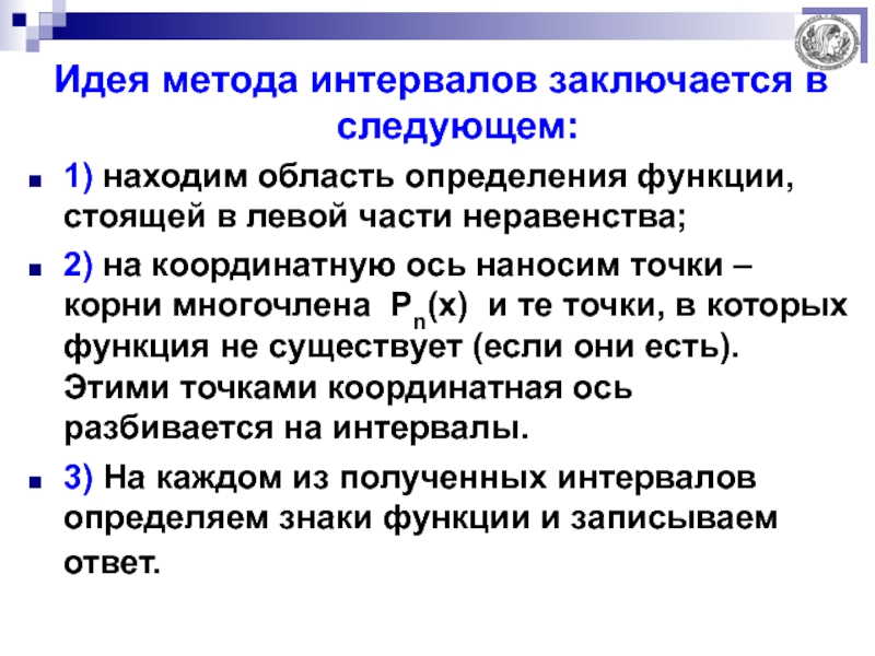 Идея метода интервалов заключается в следующем:1) находим область определения функции, стоящей в левой части неравенства;2) на координатную