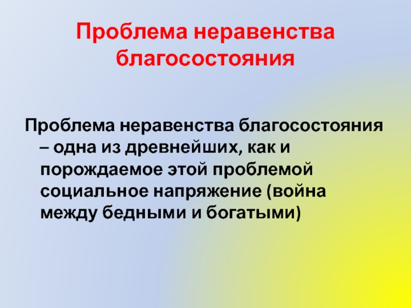 Проблема неравенства благосостояния Проблема неравенства благосостояния – одна из древнейших, как и порождаемое этой проблемой социальное напряжение