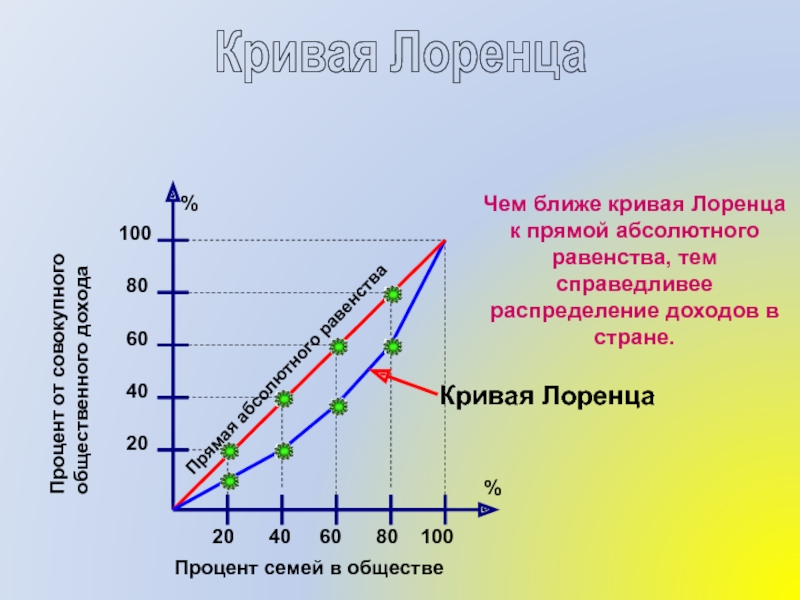 Кривая ЛоренцаПрямая абсолютного равенстваПроцент от совокупного общественного доходаПроцент семей в обществе4020608010020406080100%%Кривая ЛоренцаЧем ближе кривая Лоренца к прямой