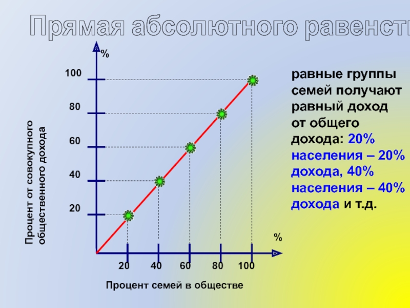 Прямая абсолютного равенстваПроцент от совокупного общественного доходаПроцент семей в обществе4020608010020406080100%%равные группы семей получают равный доход от общего