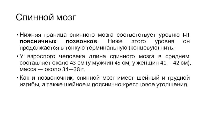 взрослого человека длина спинного мозга в среднем составляет около 43 см (у мужчин 45 см, у женщин 41— 42 см), масса — около 34—38 г.
