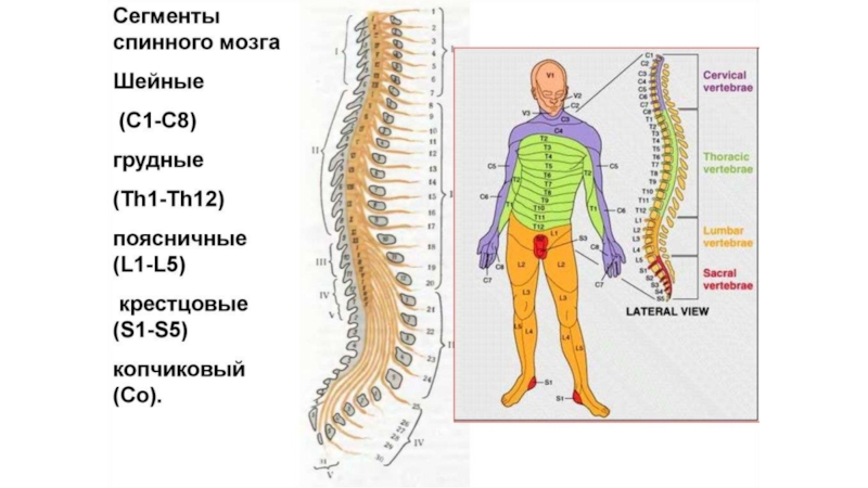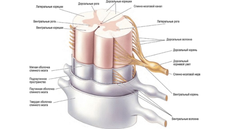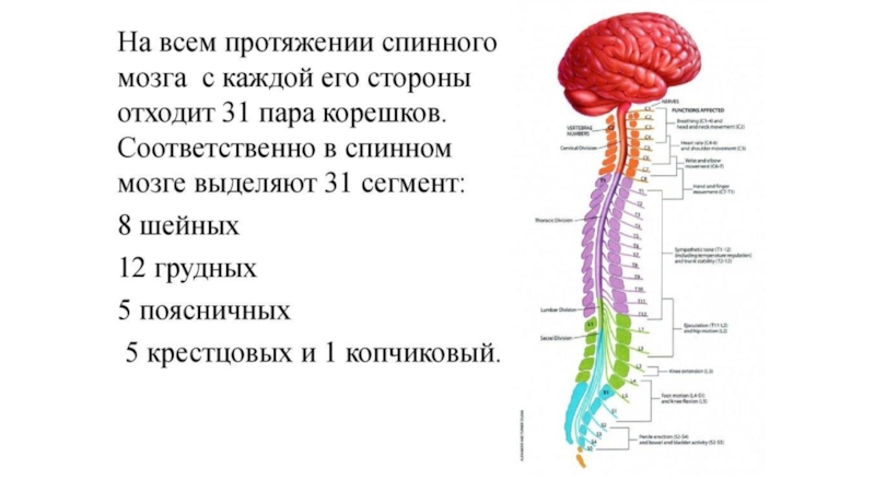 спинного мозга с каждой стороны отходит 31 пара передних и задних корешков, которые соединяются и образуют 31 пару правых и левых спинномозговых нервов.