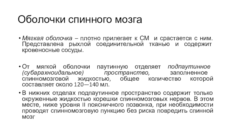 В нижних отделах подпаутинное пространство содержит только окруженные жидкостью корешки спинномозговых нервов. В этом месте, ниже уровня II поясничного позвонка, при необходимости проводят спинномозговую пункцию без риска повредить спинной мозг