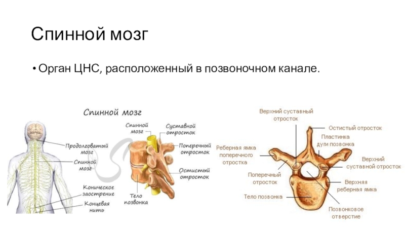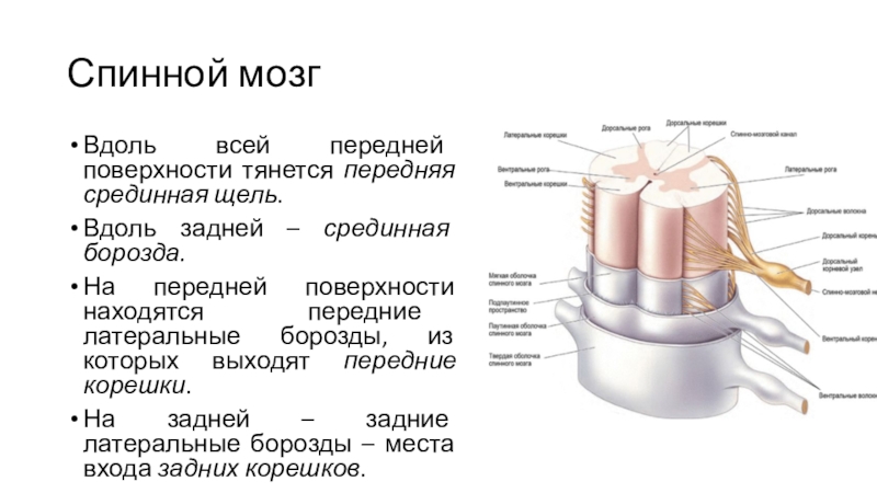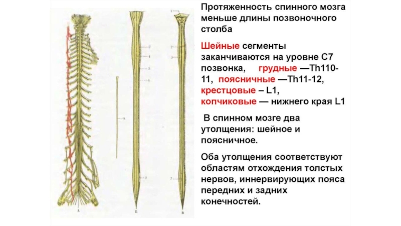 Как и позвоночник, спинной мозг имеет шейный и грудной изгибы, а также шейное и пояснично-крестцовое утолщения.