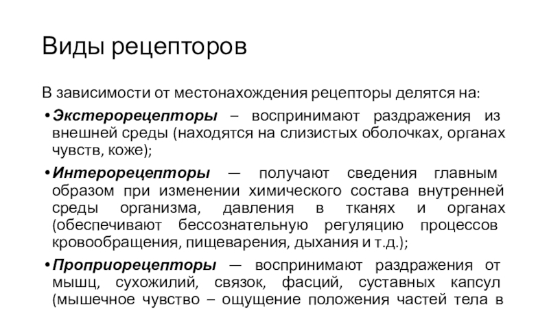 Проприорецепторы — воспринимают раздражения от мышц, сухожилий, связок, фасций, суставных капсул (мышечное чувство – ощущение положения частей тела в пространстве).