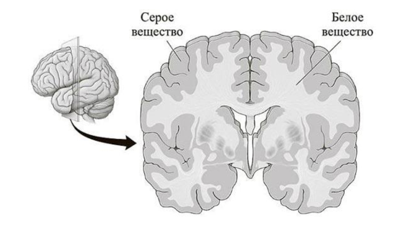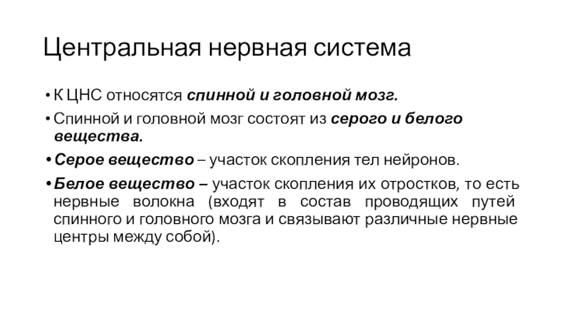 Белое вещество – участок скопления их отростков, то есть нервные волокна (входят в состав проводящих путей спинного и головного мозга и связывают различные нервные центры между собой).