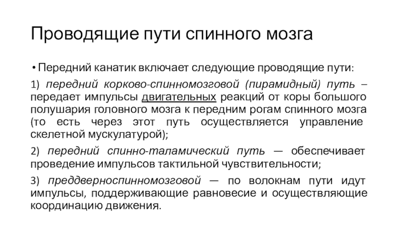 латеральный корково-спинномозговой (пирамидный) — проводит двигательные импульсы от коры большого мозга к спинному мозгу;