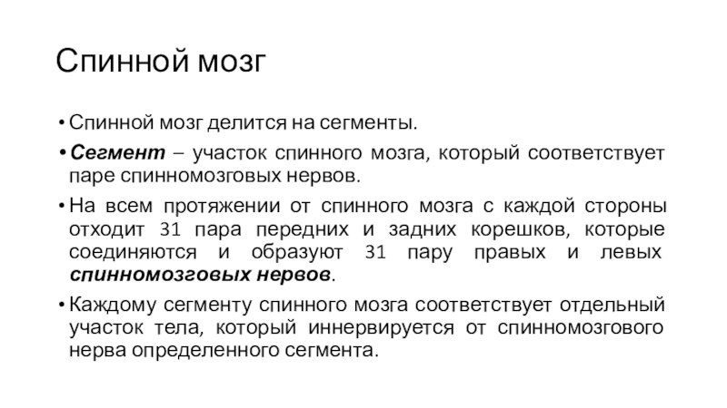 Каждому сегменту спинного мозга соответствует отдельный участок тела, который иннервируется от спинномозгового нерва определенного сегмента.
