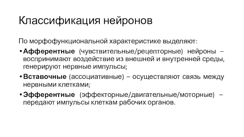 Афферентные (чувствительные/рецепторные) нейроны – воспринимают воздействие