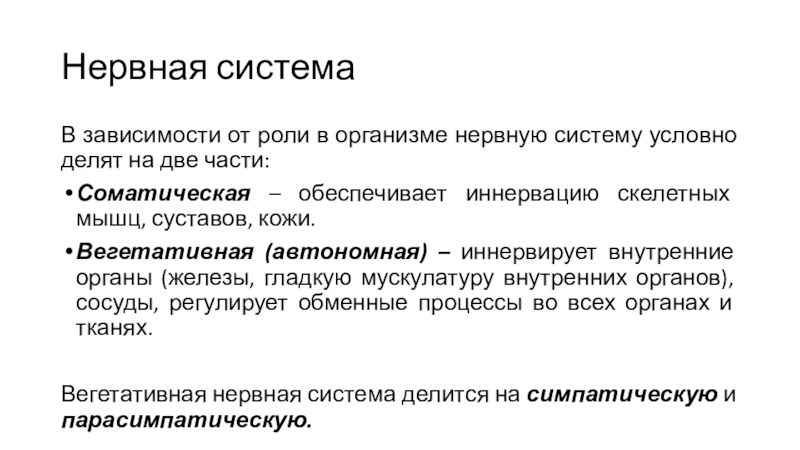 Вегетативная (автономная) – иннервирует внутренние органы (железы, гладкую мускулатуру внутренних органов), сосуды, регулирует обменные процессы во всех органах и тканях.
