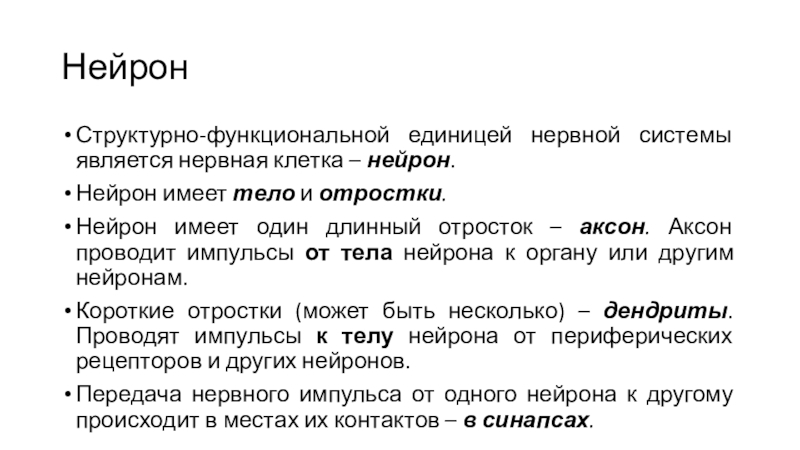 Короткие отростки (может быть несколько) – дендриты. Проводят импульсы к телу нейрона от периферических рецепторов и других нейронов.
