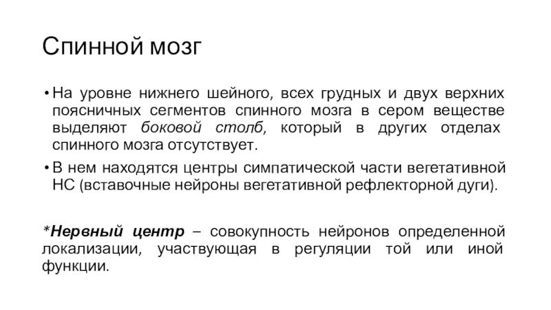 В нем находятся центры симпатической части вегетативной НС (вставочные нейроны вегетативной рефлекторной дуги).