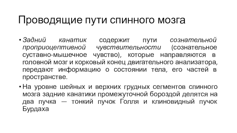 На уровне шейных и верхних грудных сегментов спинного мозга задние канатики промежуточной бороздой делятся на два пучка — тонкий пучок Голля и клиновидный пучок Бурдаха