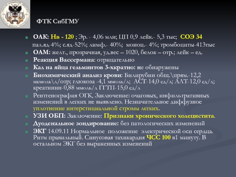 Лихорадка, тахикардия, лейкоцитоз, тромбоцитоз, увеличение СОЭ, гипопротеинемия, С-реактивный белок