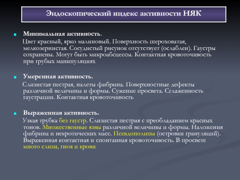 В острой стадии НЯК - экссудативный отек, полнокровие слизистой оболочки, складки утолщаются и сглаживаются. При переходе процесса в хронический