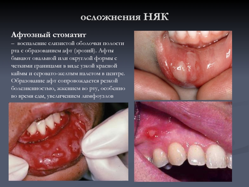 Образование афт сопровождается резкой болезненностью, жжением во рту, особенно во время еды, увеличением лимфоузлов
