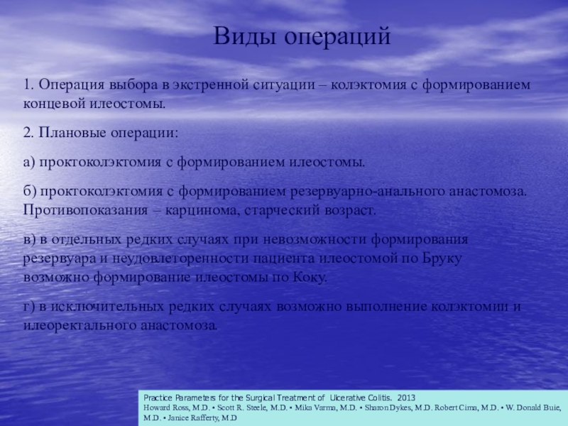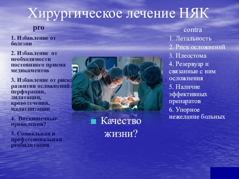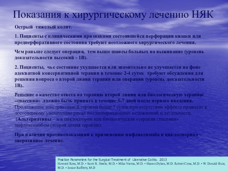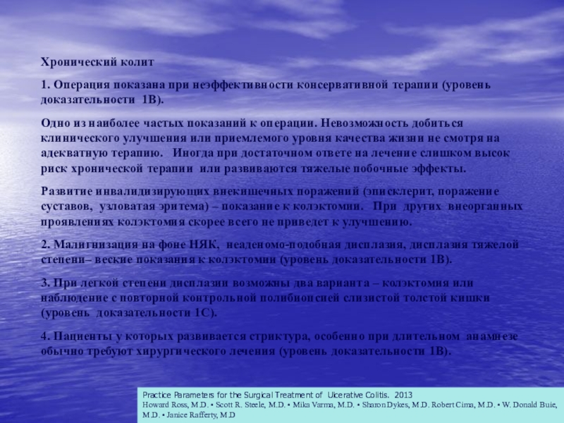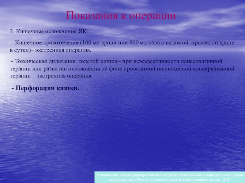 2. Относительные: кишечные свищи, хроническая обструкция, хроническое активное течение колита Неэффективность или плохая переносимость консервативного лечения.
