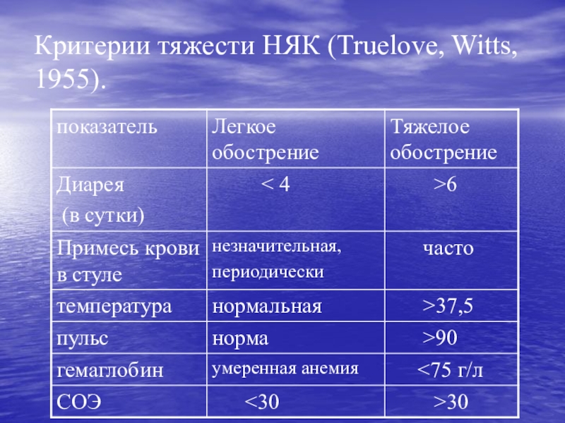 Слайд 7Критерии тяжести НЯК (Truelove, Witts, 1955).