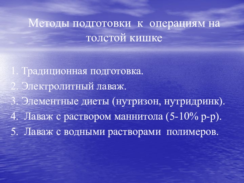 Слайд 49Методы подготовки к операциям на толстой кишке
