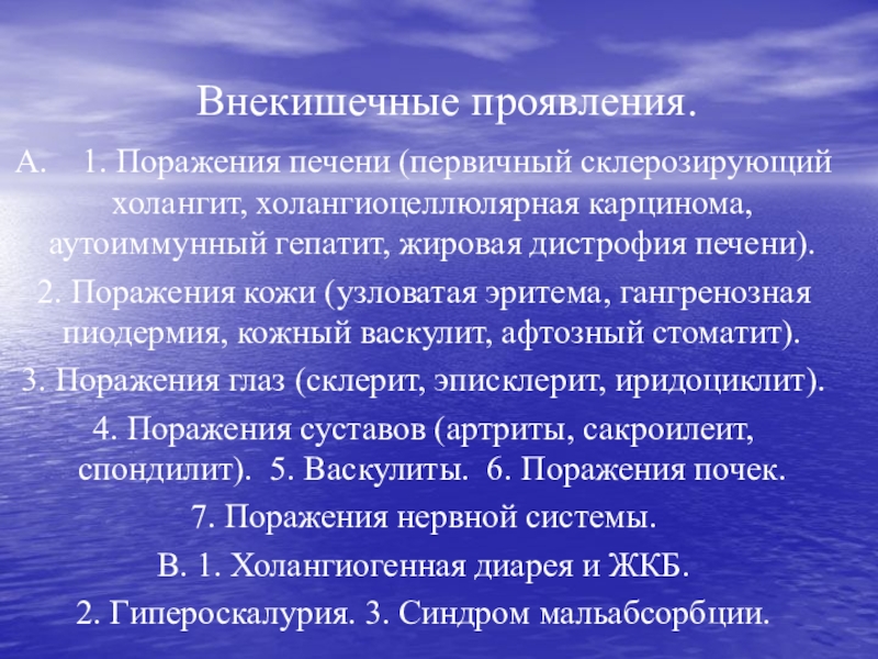 А. 1. Поражения печени (первичный склерозирующий холангит, холангиоцеллюлярная