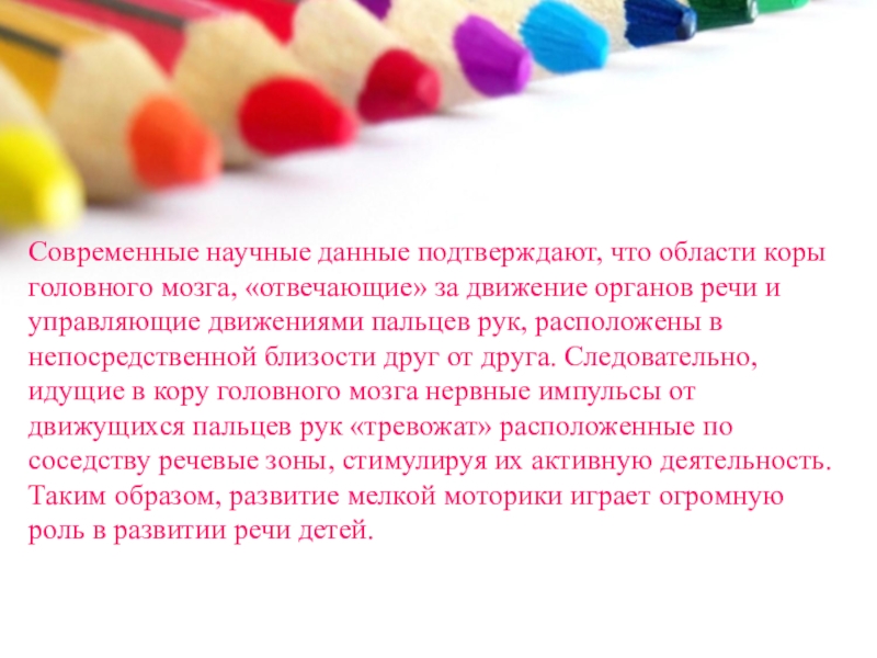 в непосредственной близости друг от друга. Следовательно, идущие в кору головного мозга нервные импульсы от движущихся пальцев рук «тревожат» расположенные по соседству речевые зоны, стимулируя их активную деятельность. Таким образом, развитие мелкой моторики играет огромную роль в развитии речи детей.