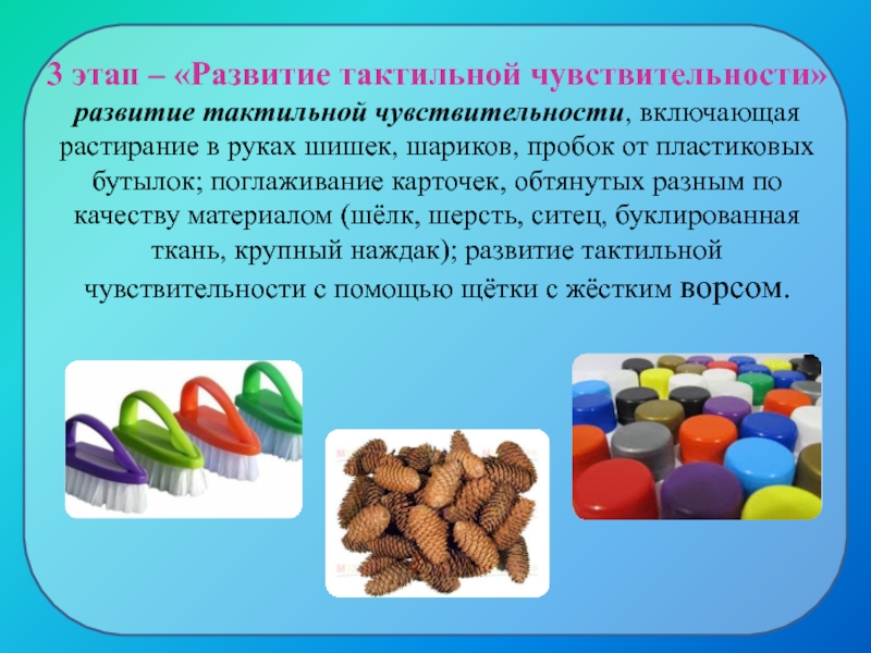 обтянутых разным по качеству материалом (шёлк, шерсть, ситец, буклированная ткань, крупный наждак); развитие тактильной чувствительности с помощью щётки с жёстким ворсом.