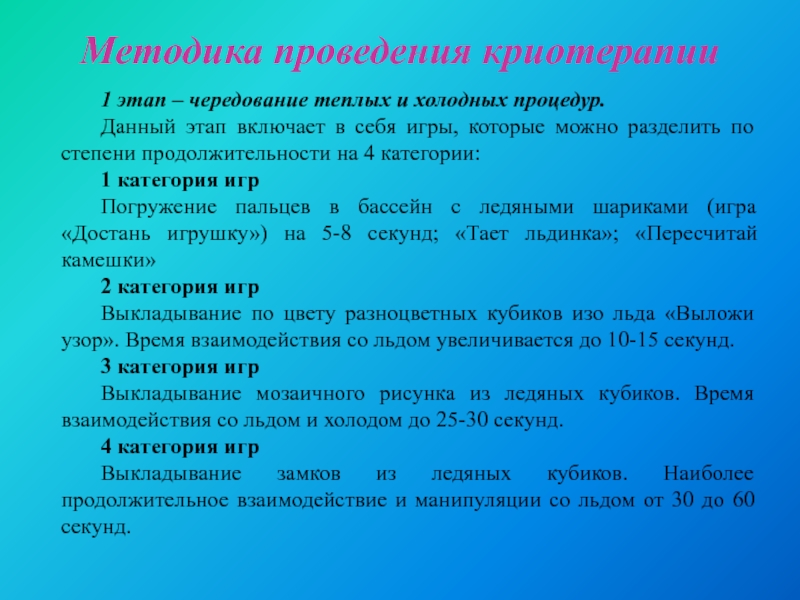 с длительно и часто болеющими детьми; гипервозбудимыми детьми. Криотерапия противопоказана при повышенной индивидуальной чувствительности к процедуре (непереносимость холода), если присутствует лихорадочное состояние (жар, повышенная температура тела), при обострении респираторных заболеваний, в том числе вирусных (ОРВИ, ОРЗ и др).