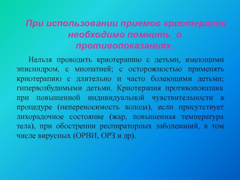 Слайд 16При использовании приемов криотерапии необходимо помнить о противопоказаниях.
