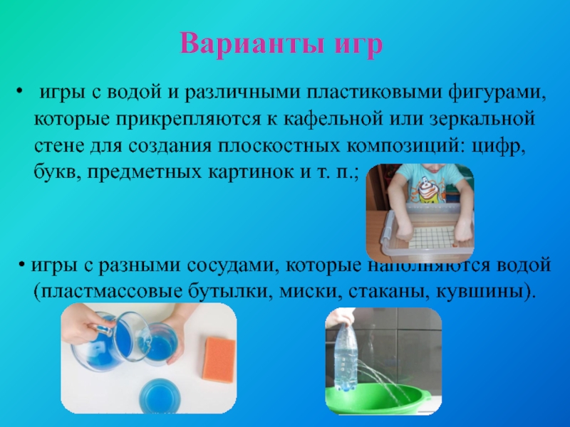 • игры с разными сосудами, которые наполняются водой (пластмассовые бутылки, миски, стаканы, кувшины).