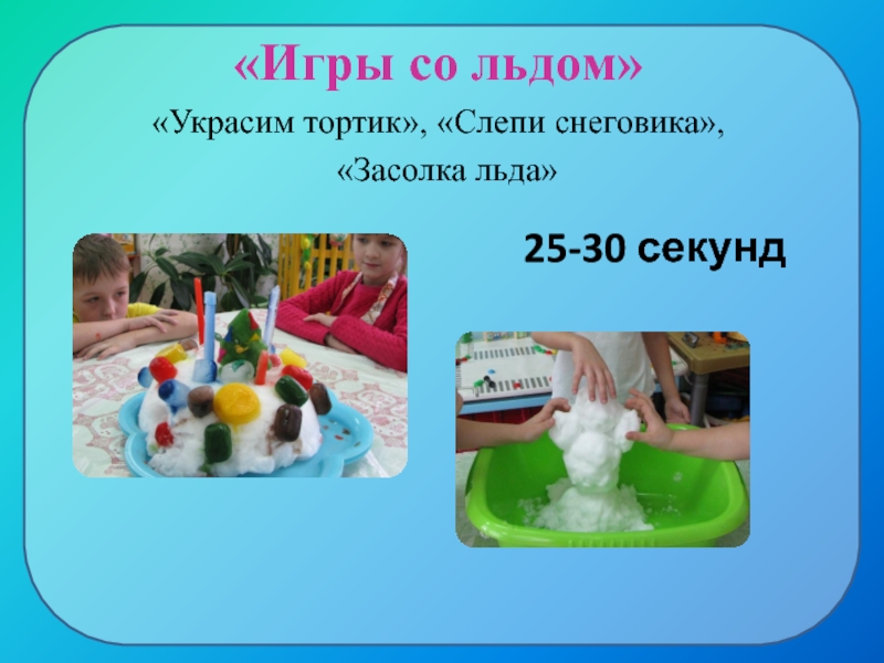 Выкладывание замков из ледяных кубиков. Наиболее продолжительное взаимодействие и манипуляции со льдом от 30 до 60 секунд.