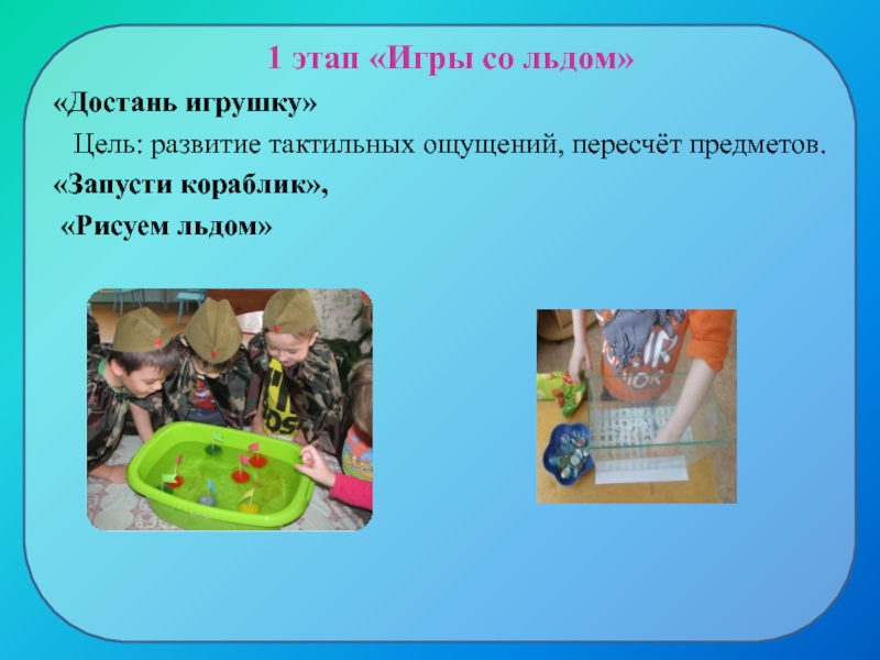 Погружение пальцев в бассейн с ледяными шариками (игра «Достань игрушку») на 5-8 секунд; «Тает льдинка»; «Пересчитай камешки»