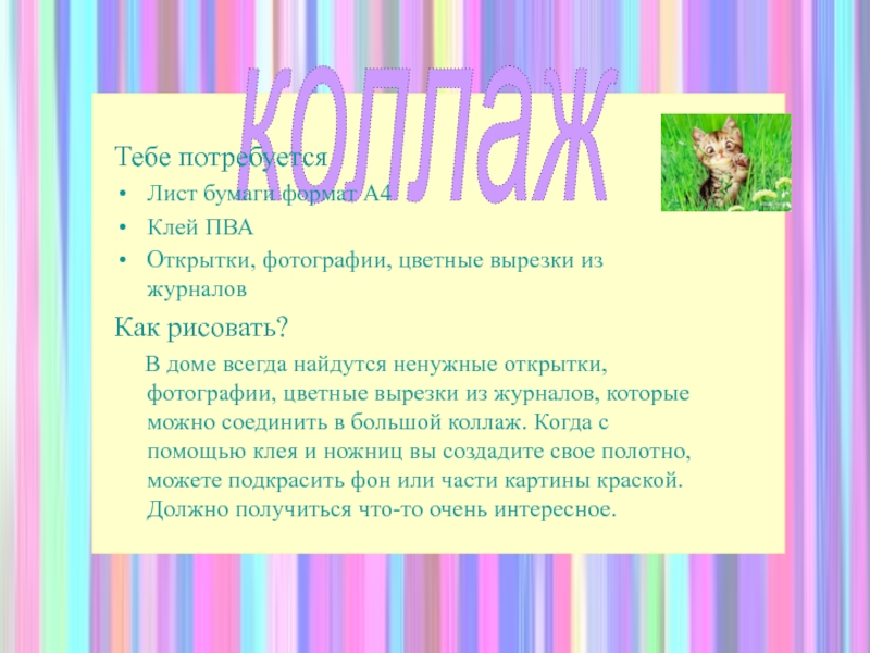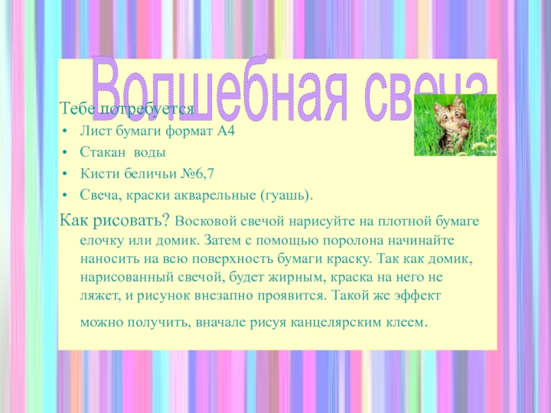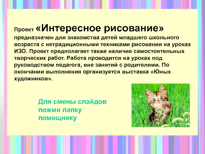 наличие самостоятельных творческих работ. Работа проводится на уроках под руководством педагога, вне занятий с родителями. По окончании выполнения организуется выставка «Юных художников».Для смены слайдов пожми лапку помощнику