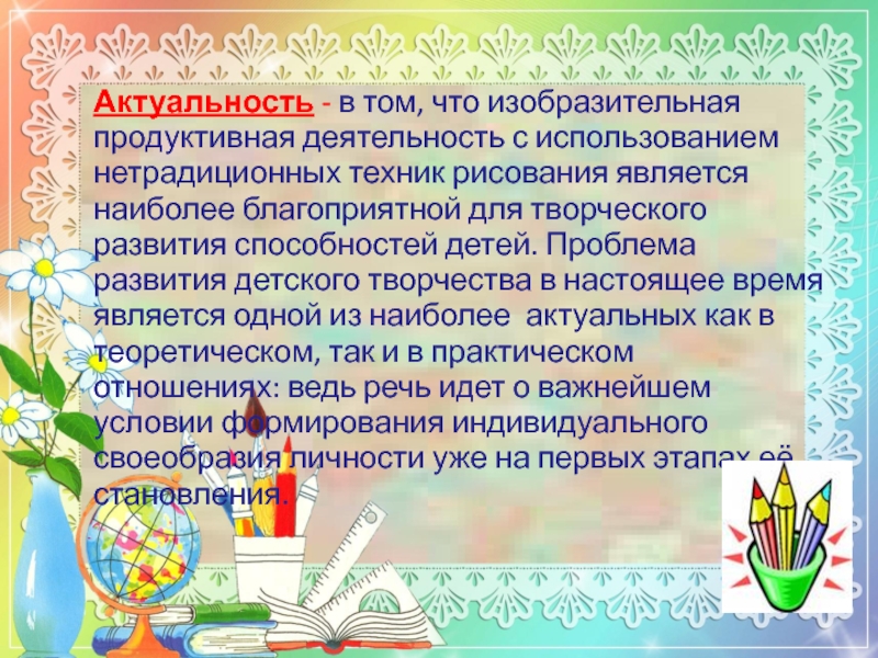 Слайд 3Актуальность - в том, что изобразительная продуктивная деятельность с использованием нетрадиционных