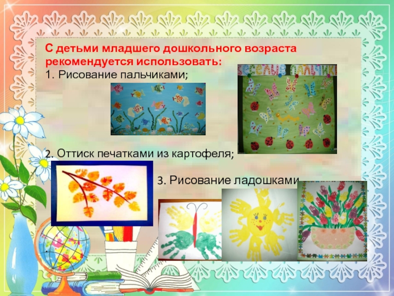 по изобразительной деятельности соблюдайте систему и преемственность использования нетрадиционных изобразительных техник, учитывая возрастные и индивидуальные способности детей;