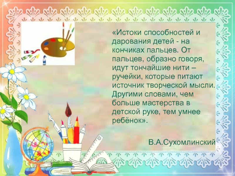 Слайд 4«Истоки способностей и дарования детей - на кончиках пальцев. От