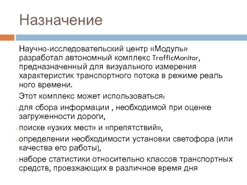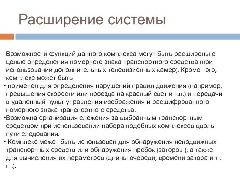 Комплекс может быть использован для обнаружения неподвижных транспортных средств или обнаружения пробок (заторов ), а также для вычисления их параметров (длины очереди, времени затора и т .п .).