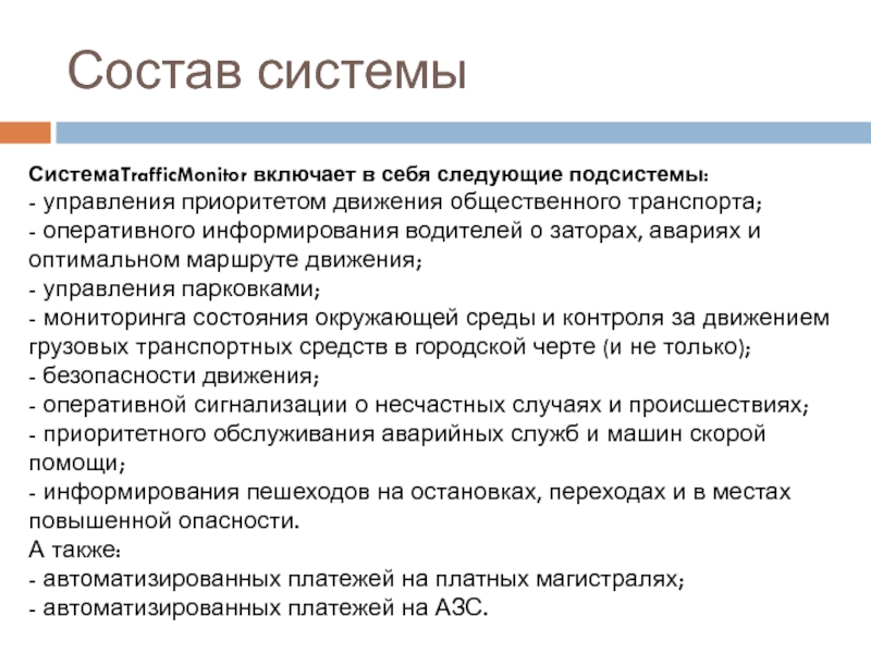 СистемаTrafficMonitor включает в себя следующие подсистемы: