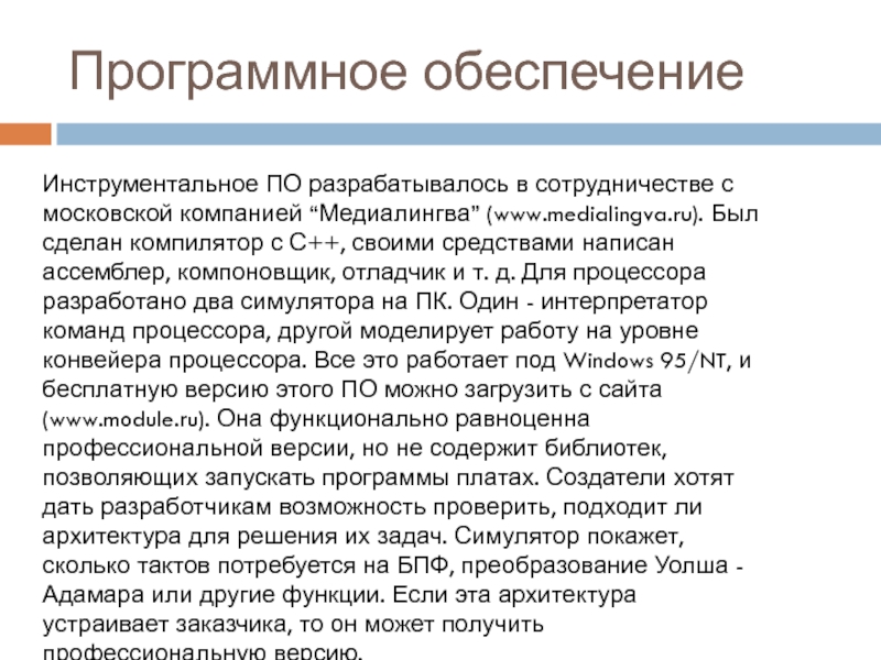 компоновщик, отладчик и т. д. Для процессора разработано два симулятора на ПК. Один - интерпретатор команд процессора, другой моделирует работу на уровне конвейера процессора. Все это работает под Windows 95/NT, и бесплатную версию этого ПО можно загрузить с сайта (www.module.ru). Она функционально равноценна профессиональной версии, но не содержит библиотек, позволяющих запускать программы платах. Создатели хотят дать разработчикам возможность проверить, подходит ли архитектура для решения их задач. Симулятор покажет, сколько тактов потребуется на БПФ, преобразование Уолша - Адамара или другие функции. Если эта архитектура устраивает заказчика, то он может получить профессиональную версию.