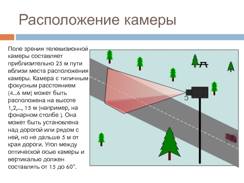 мм) может быть расположена на высоте 1,2,..., 15 м (например, на фонарном столбе ). Она может быть установлена над дорогой или рядом с ней, но не дальше 5 м от края дороги. Угол между оптической осью камеры и вертикалью должен составлять от 15 до 60°.