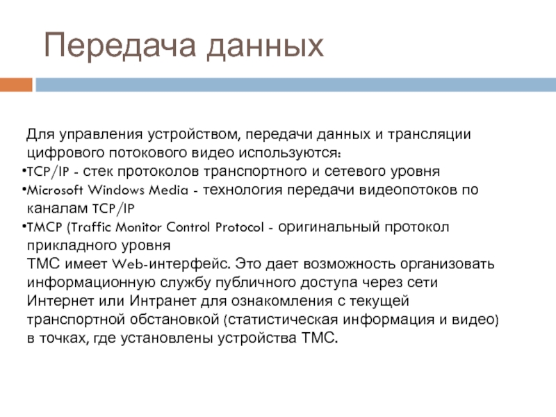 ТМС имеет Web-интерфейс. Это дает возможность организовать информационную службу публичного доступа через сети Интернет или Интранет для ознакомления с текущей транспортной обстановкой (статистическая информация и видео) в точках, где установлены устройства ТМС.