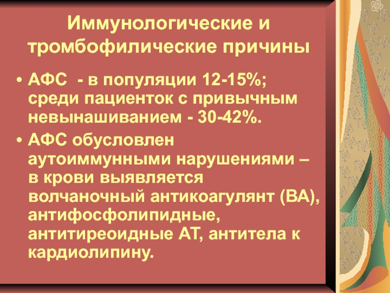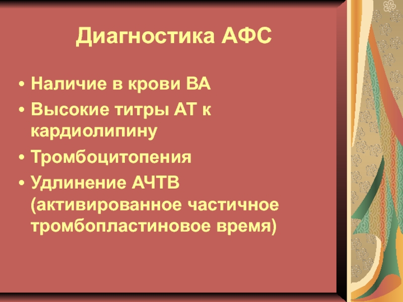 – в крови выявляется волчаночный антикоагулянт (ВА), антифосфолипидные, антитиреоидные АТ, антитела к кардиолипину.