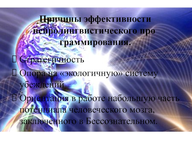Слайд 18Причины эффективности нейролингвистического про граммирования.