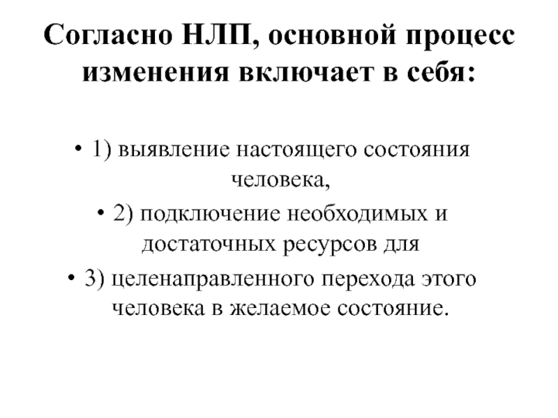 Слайд 12Согласно НЛП, основной процесс изменения включает в себя: