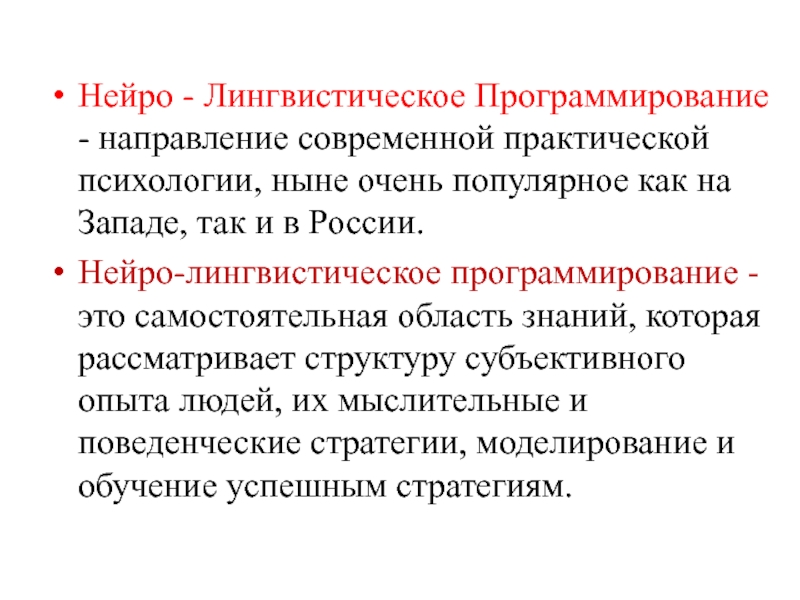 Слайд 2Нейро - Лингвистическое Программирование - направление современной практической психологии, ныне